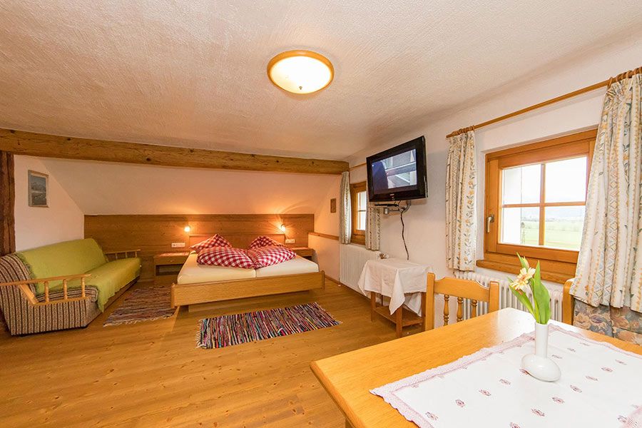Unsere Einraumferienwohnung in Maishofen ist ein gemütlicher Rückzugsort in Ihrem Bauernhofurlaub in der Region Zell am See. Sie bietet Platz für bis zu 3 Personen und ist mit gratis W-Lan, Flat TV und einer Küchenzeile inklusiv 2-Platten Herd, Kühlschrank, Kaffeemaschine und Wasserkocher ausgestattet.