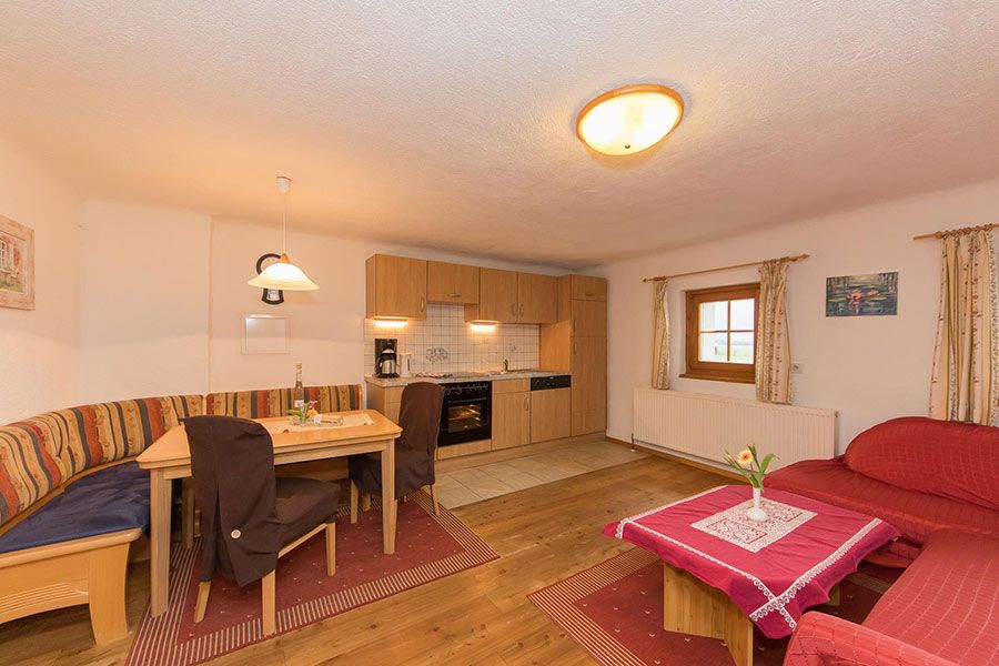 Wer für seinen Urlaub in der Region Zell am See eine Unterkunft auf einem Familienbauernhof sucht, findet sie in unserer gemütlichen Ferienwohnung 6. Sie ist ausgestattet mit gratis W-Lan, TV und einer komplett eingerichteten Küche mit 4-Platten Herd inkl. Backofen, Geschirrspüler, Kühlschrank, Wasserkocher und Kaffeemaschine.